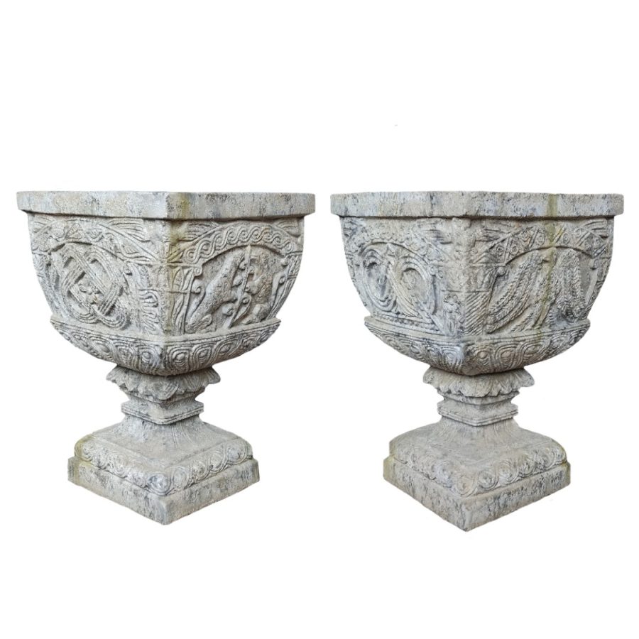 Vase 4 Faces avec Decors Differents est une pièce décorative en pierre reconstituée, pensée pour embellir les extérieurs. Il peut être mis en scène seul ou accueillir une composition végétale pour rythmer élégamment les extérieurs. La finition patinée et vieillie est entièrement réalisée dans notre atelier du Sud de la France.